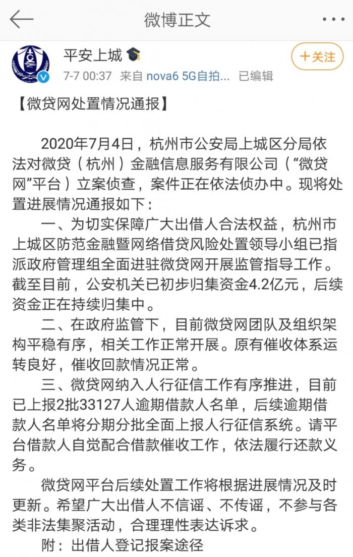 “平安上城”公告称,2020年7月4日,杭州市公安局上城区分局依法对微贷(杭州)金融信息服务有限公司(“微贷网”平台)立案侦查,案件正在依法侦办中。现将处置进展情况通报如下:
