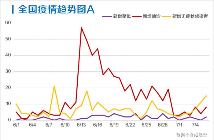 据国家卫健委关于新型冠状病毒肺炎通报的最新数据,7月6日,31个省(自治区、直辖市)和新疆生产建设兵团报告新增确诊病例8例,均为境外输入病例;新增无症状感染者15例,其中境外输入14例;新增疑似病例2例,均为境外输入病例;新增治愈出院病例10例,重症病例较前一日增加1例,无新增死亡病例。