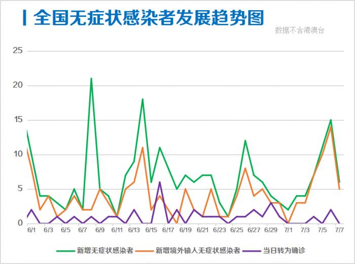 7月6日,全国新增无症状感染者15例,其中境外输入14例;当日转为确诊病例2例(境外输入2例);当日解除医学观察8例(境外输入7例);尚在医学观察无症状感染者114例(境外输入77例)。