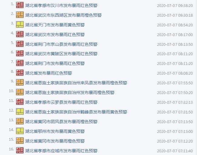 7月7日是湖北省的高考首日,截至7月7日9时,过去24小时内,湖北省已发布各级别的暴雨预警信息42条,其中从7月7日零时开始,湖北省孝感、荆门、武汉三市已发布8条属最高等级的暴雨红色预警信息。