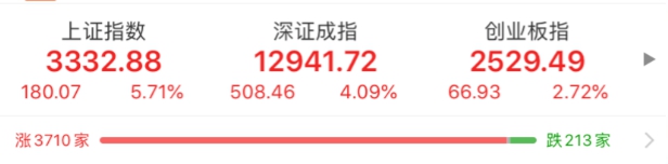 截至收盘,沪指涨5.71%,深成指涨4.09%,创业板指涨2.72%。