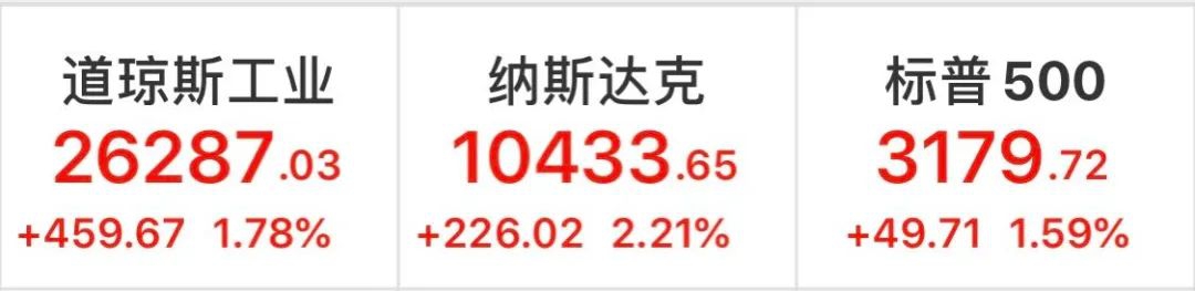 美股方面,截至收盘,道指涨459.67点,涨幅1.78%,报26287.03点;纳指涨226.02点,涨幅2.21%,报10433.65点,续创收盘历史新高;标普500指数涨49.71点,涨幅1.59%,报3179.72点。