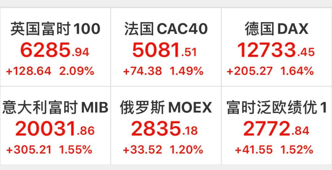 欧股方面,截至收盘,英国富时100指数报于6285.94点,比前一交易日上涨128.64点,涨幅为2.09%。德国DAX指数报于12733.45点,比前一交易日上涨205.27点,涨幅为1.64%。法国CAC40指数报于5081.51点,比前一交易日上涨74.37点,涨幅为1.49%。