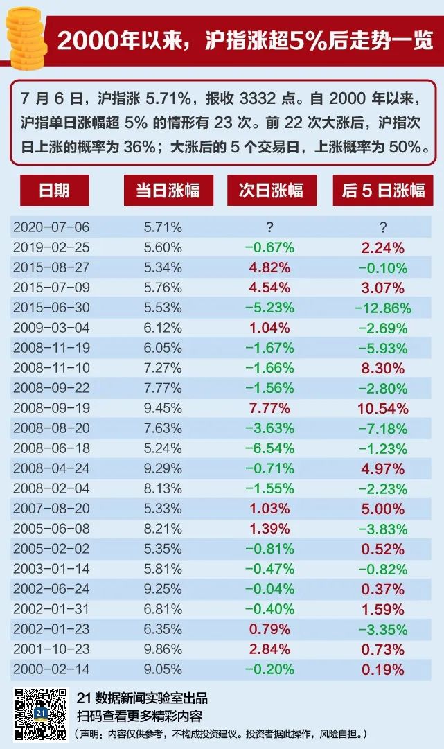 21数据新闻实验室统计发现,自2000年以来,沪指单日涨幅超5%的情形有23次。前22次大涨后,沪指次日上涨的概率为36%;大涨后的5个交易日,沪指上涨概率为50%。
