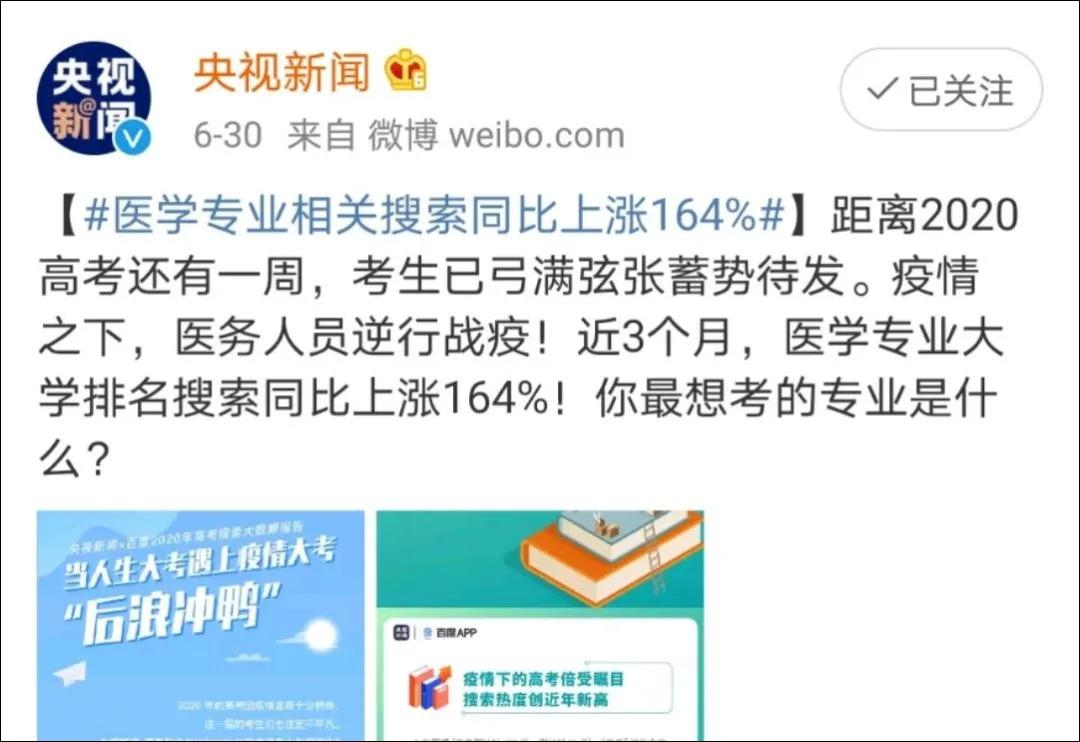 没有想到的是,在今年,央视新闻和百度联合推出的《2020年高考搜索大数据报告》中,“临床医学”挤进了榜单前十。