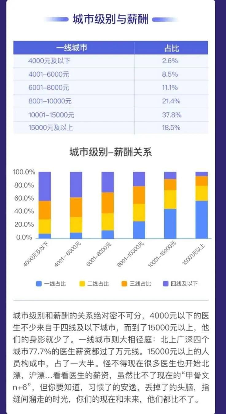 那么医生薪酬状况如何?根据医脉通5000多份有效问卷的调研数据看来,北上广深四个城市77.7%的医生薪资都过了万元线,1.5万元以上的人员构成中,占了一大半。