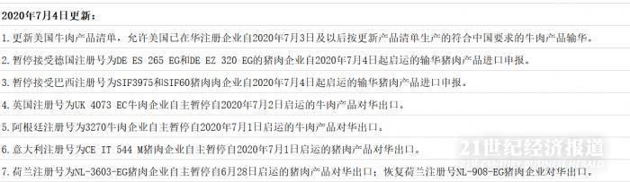 据21世纪经济报道记者统计,6月下旬以来,上述清单已7次更新,内容均为暂停部分肉类企业的产品输华申报,或部分肉类企业自主暂停产品对华出口,总共涉及23家肉类企业。