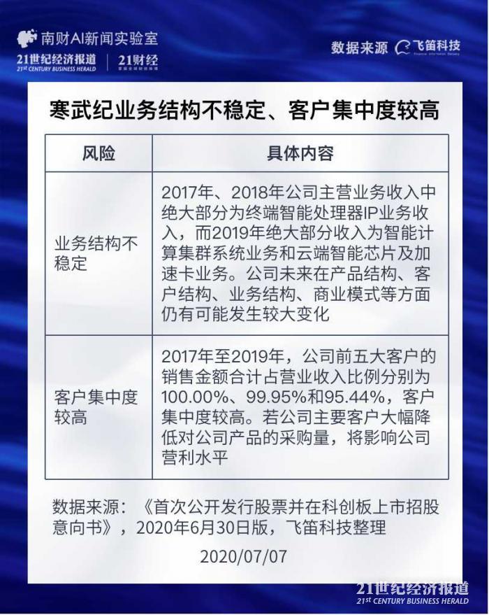 寒武纪于6月30日发布的招股说明书中提示了多个风险点。经南财AI新闻实验室梳理,有两大风险点跟公司经营高度相关,分别是业务结构不稳定、客户集中度较高的风险。
