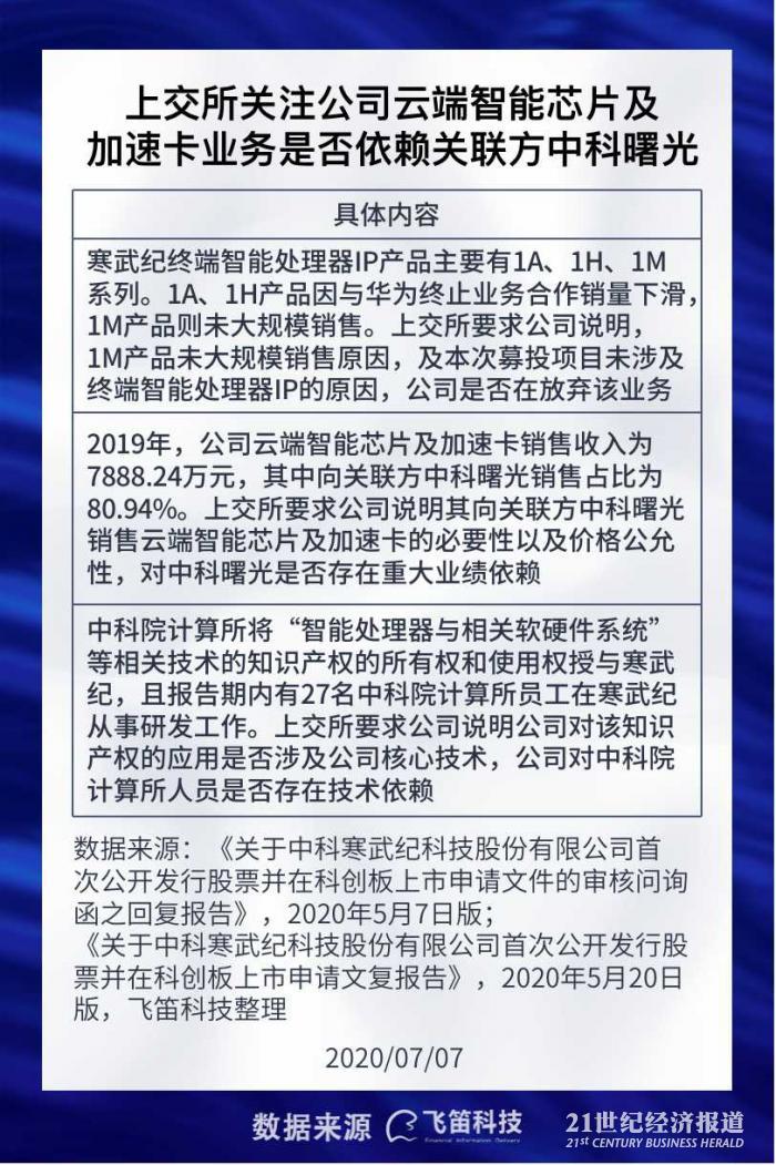 第二个问题。据公司招股书,中科曙光为公司直接持股5%以上股东中科算源控制的企业,属于公司关联方。2019年,公司云端智能芯片及加速卡销售收入7888.24万元,其中向中科曙光销售加速卡6384.43万元,关联销售占比为80.94%,占比大。因此,上交所要求公司说明其向关联方中科曙光销售云端智能芯片及加速卡的必要性以及价格公允性,对中科曙光是否存在重大业绩依赖。