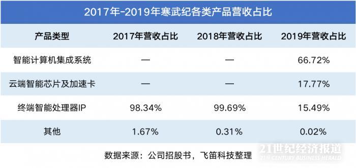 据公司招股书,公司的业务结构不稳定,具体表现为智能计算集群系统业务可持续性存疑、云端智能芯片及加速卡关联方销售占比高、以及智能处理器IP面临华为海思竞争三大方面。2019年,这三大业务分别占公司营业收入比重为66.72%、17.77%、15.49%。