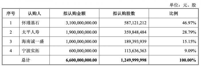 根据预案信息,本次发行对象为怀瑾基石、太平人寿、海南诚一盛和宁波实拓共4名特定对象,四家机构分别认购31亿元、19亿元、10亿元和6亿元。