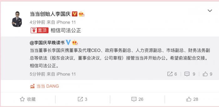 随后,李国庆创办的早晚读书发微博称,当当董事长李国庆携董事及代理CEO、政府事务副总、人力资源副总、市场副总、财务法务副总等依法(股东会决议,董事会决议,公司章程)接管当当并开始办公。希望俞渝配合交接。相信司法公正。