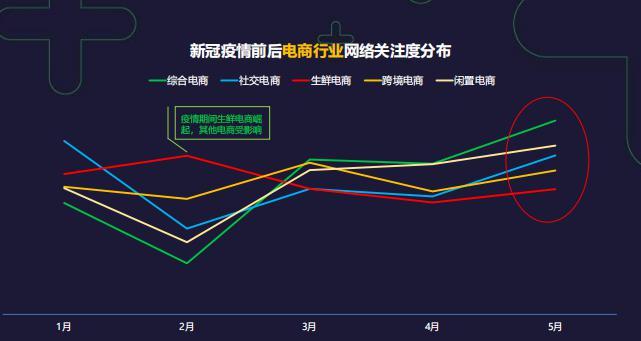 在后续的3、4、5月份,综合电商、社交电商、跨境电商、闲置电商等细分领域关注度逐渐回升,体现出强劲复苏态势。