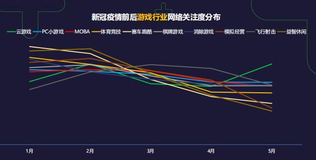 第二,在游戏行业,云游戏、PC小游戏、MOBA、体育竞技、赛车跑酷等细分游戏赛道在1月份和2月份疫情影响最严重时,网络关注度均处于较高水平。后续随着疫情逐步得到控制,细分游戏赛道关注度体现出分化态势。云游戏关注度飙升,新形态游戏随新基建的推动,逐渐走入消费者内心。其它类型游戏的关注度则有所下降。
