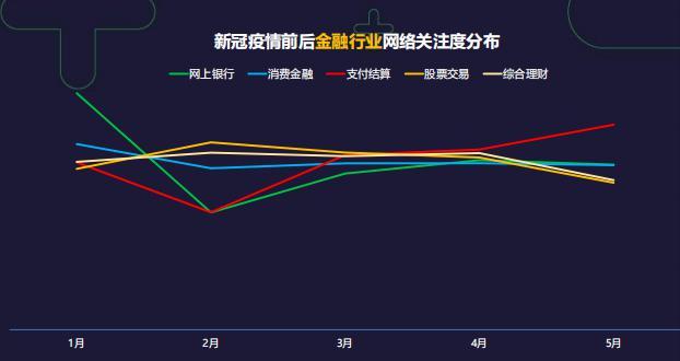 第四,在金融行业,在2月份疫情影响最严重时,金融细分领域的关注度呈现出分化态势。股票交易、综合理财的关注度上升,网上银行、消费金融、支付结算的关注度大幅下降。