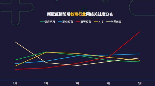 第五,在教育行业,疫情发生前关注度最高的学前教育受疫情影响最为严重,其关注度在2月份迎来骤降,后在3月份趋于平稳,并于4、5月份进入恢复状态。
