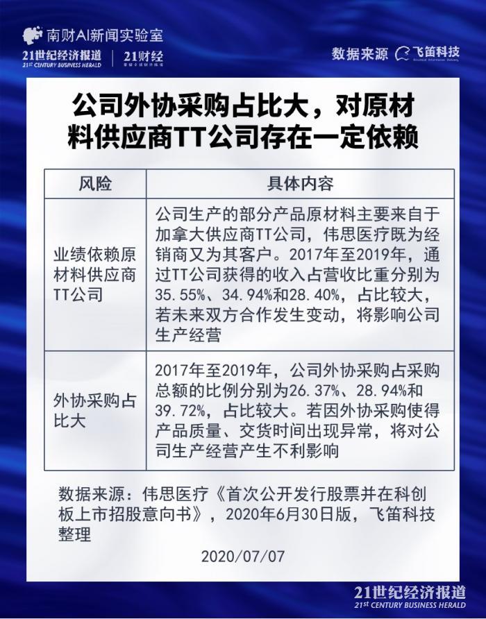 首先是公司收入依赖原材料供应商TT公司的问题。加拿大TT公司是一家生物反馈、神经反馈和精神生理仪器制造商,拥有ISO13485医疗器械认证等多项资质。据招股书,公司与TT公司存在两种合作模式,一种是作为经销商采购TT公司的整套产品,另一种是作为客户采购TT的零部件,并通过研发设计形成自身的医疗/非医疗器械产品。2017年至2019年,两者合计收入为5091万元、7205万元和9004万元,占主营业务收入比重分别为35.55%、34.94%和28.40%,占比较大。
