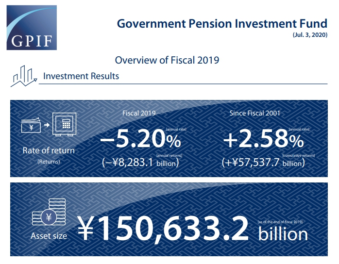 GPIF声明称,在此期间整体资产回报率为负10.71%,这样的季度亏损为GPIF在2001年开始市场化运作以来规模最大。截至2020年3月底,该基金的管理资产达150.6万亿日元。