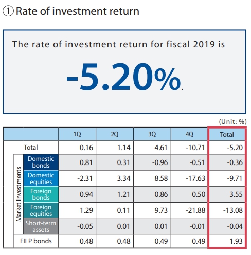 虽然2019年10-12月GPIF取得了7.4万亿日元的收益,但是纵观整个2019年,GPIF仍然亏损了8.3万亿日元,同比下降5.2%。GPIF全年投资成绩出现亏损是4年来首次。