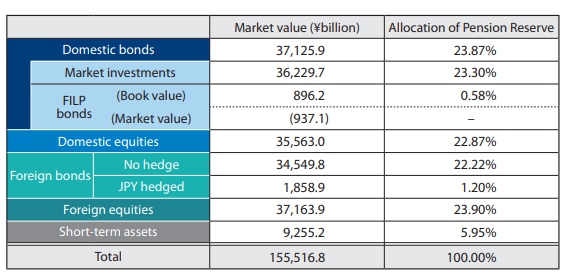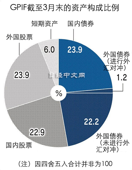 该基金当时将日本和海外股票的投资比重双双由12%调高至25%,而国内债券投资比重由60%锐减至35%。这令股票资产在GPIF中翻倍至占了“半壁江山”,以回应安倍晋三“提高冒险精神,增强对本国金融市场的信心。”