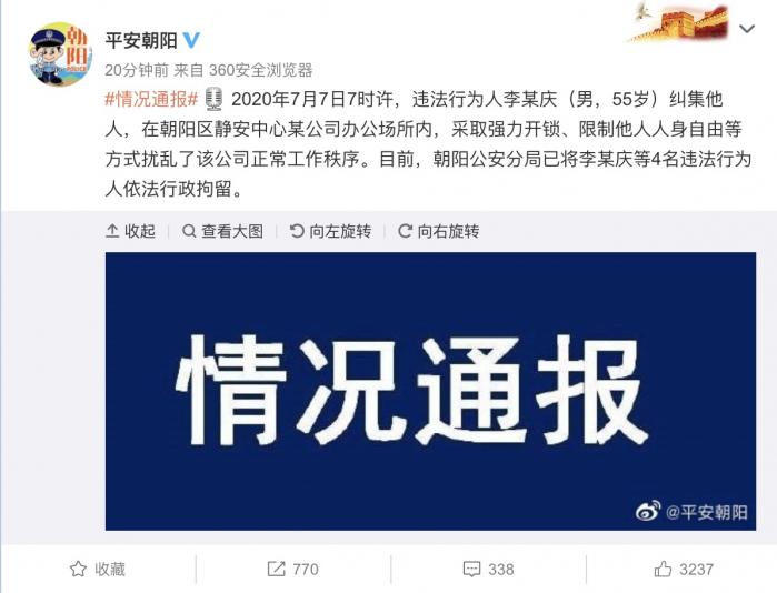 7月8日晚,平安朝阳官方微博通报称,2020年7月7日7时许,违法行为人李某庆(男,55岁)纠集他人,在朝阳区静安中心某公司办公场所内,采取强力开锁、限制他人人身自由等方式扰乱了该公司正常工作秩序。目前,朝阳公安分局已将李某庆等4名违法行为人依法行政拘留。