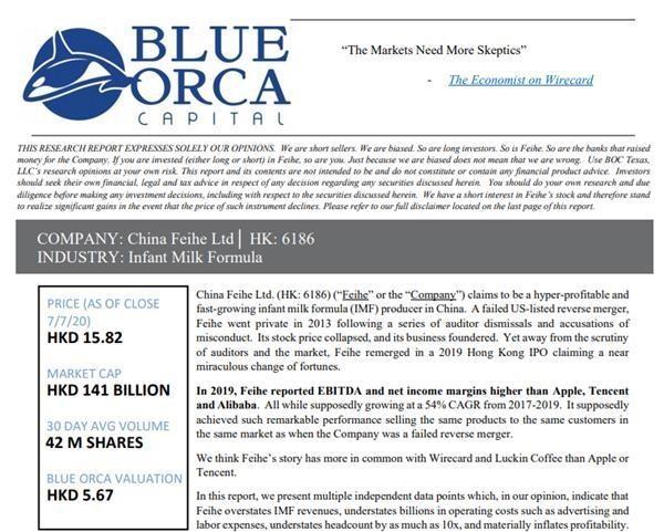 7月8日,沽空机构Blue Orca Capital(杀人鲸资本)发布一份针对中国飞鹤(06186.HK)的做空报告,指飞鹤不仅夸大了其婴儿奶粉的收入,同时还存在虚报数十亿美元的运营费用以及夸大数十亿美元资本支出等行为,认为该公司每股只值5.67港元。