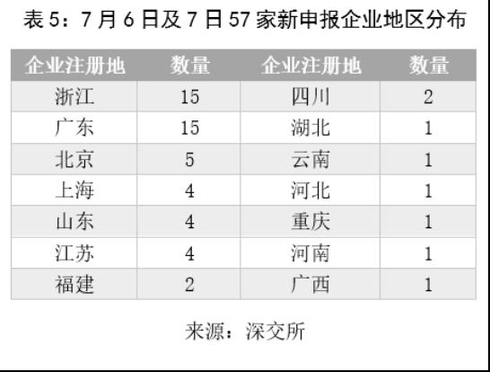以地区分布统计,本次新申报企业中,浙江和广东平分秋色,各有15家;其余北京5家,山东、上海和江苏各有4家,四川、福建也分别有2家,湖北等地则仅有1家。