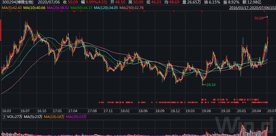 7月6日一早,博雅生物再次发布公告称,其控股股东深圳市高特佳投资集团有限公司(下称高特佳集团)正在筹划涉及公司股权变动的重大事项。随即,该公司股价当日强势涨停,截至2020年7月6日收盘,博雅生物报收于49.59元/股,创历史新高。