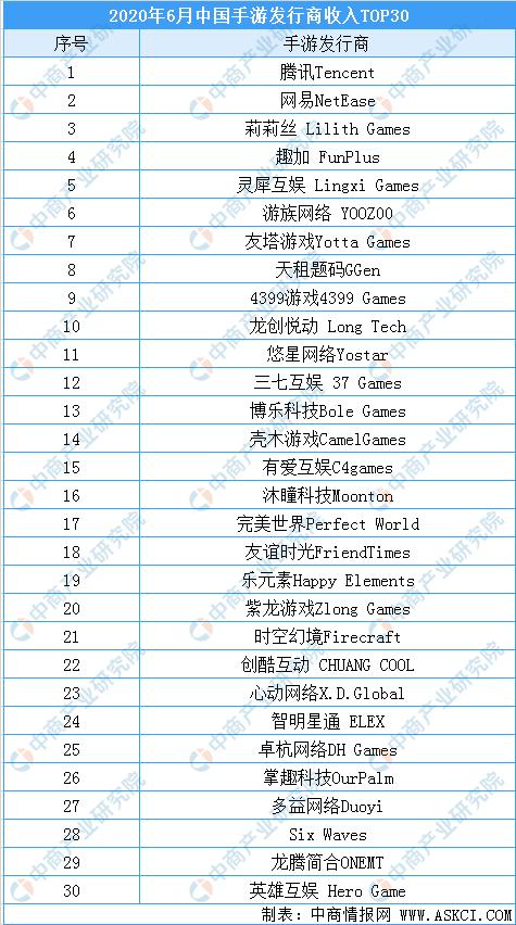 6月中国手游发行商收入排行榜:腾讯蝉联第一网易第二莉莉丝第三