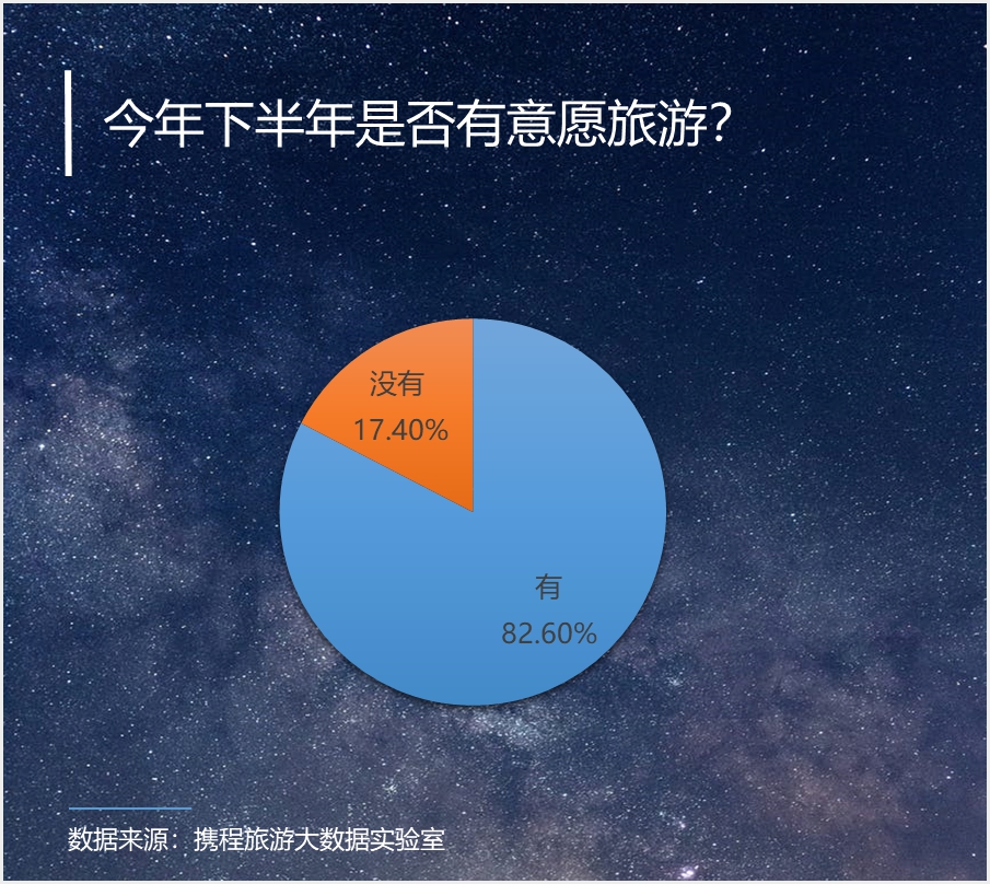 携程发布的《下半年旅游意愿调查报告》显示,82.6%的被调查者,下半年有意愿旅游。对于长途跨省旅游,有意愿的比例也超过八成。57.1%的被调查者表示,如果今年出境游恢复不了,会考虑增加国内游频次。其中,暑期和国庆将成为下半年旅游的高峰期。