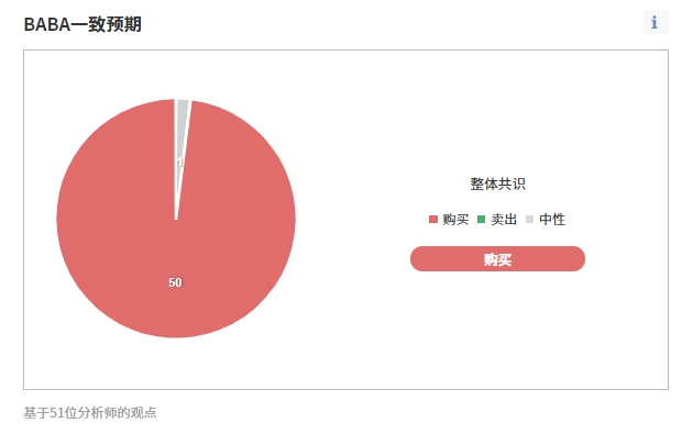 根据英为财情Investing.com的一致预期工具显示,在覆盖阿里巴巴评级的51位分析师中,有50位分析师给予公司“买入”评级,仅有一个中性评级,没有卖出评级。华尔街目前不乏看多阿里巴巴的分析师。