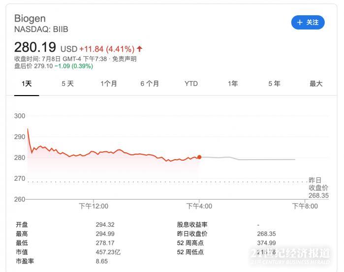 受此消息提振,周三Biogen股价上涨4.41%,每股收至280.19美元。