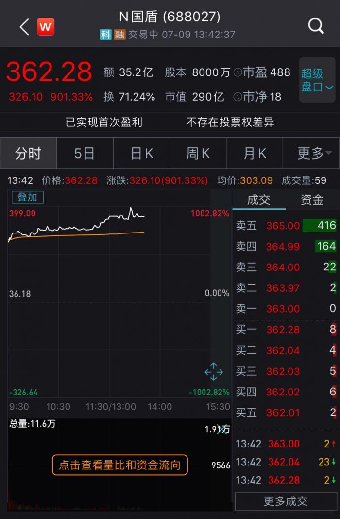 截至午间收盘,国盾量子报352.96元/股,成交额为30.4亿元,市值达282亿元。午盘开盘后,国盾量子涨幅持续扩大,盘中涨幅一度扩大至1000%,触及399元/股。截至记者发稿,涨幅超900%,市值接近300亿元。
