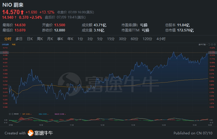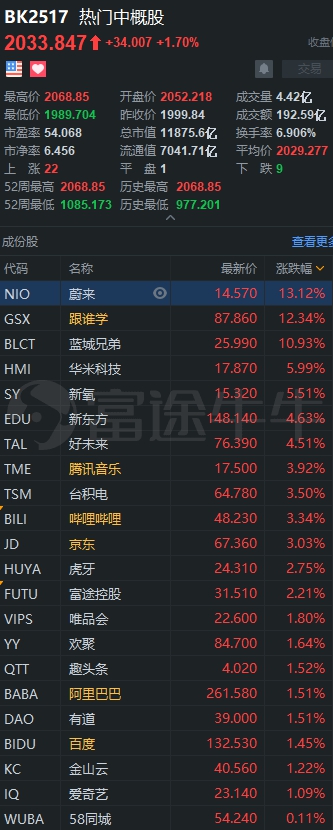大型中概股中:阿里巴巴涨1.51%,拼多多跌2.23%,京东涨3.03%,网易涨6.31%,好未来涨4.51%,百度涨1.45%,中通快递涨2.74%,腾讯音乐涨3.92%,新东方涨4.63%,跟谁学涨12.34%,爱奇艺涨1.09%,蔚来涨13.12%,哔哩哔哩涨3.34%,携程跌1.07%。