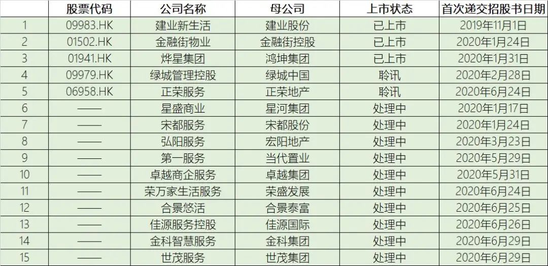 据资本邦不完全统计,截至2020年6月30日,共有15家物业公司向港交所递交上市申请(包括已上市、通过聆讯及排队中的企业), 15家均为房地产集团分拆物业管理板块单独上市,以下为公司名单: