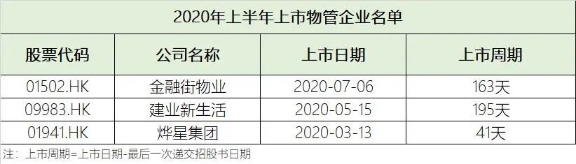 2020上半年,共有3家物业管理企业在港股上市,分别为金融街物业、建业新生活及烨星集团。以最后一次递交招股书至上市日计算,上市周期最短的物管公司当属烨星集团,上市仅用时41天,而金融街物业则耗时163天才撬开港交所的大门。