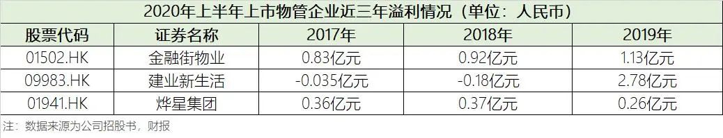 从财务数据来看,盈利并非物管公司上市的必要条件。根据招股书,金融街物业自2017年以来一直处于盈利状态,且盈利稳定增长,2018年同比增长10.8%,2019年同比增长22.8%;建业新生活于2017-2018年均处于亏损状态,合计亏损超2100万元,直到2019年公司才扭亏为盈;烨星集团在2017-2018年分别盈利0.36亿元、0.37亿元,到2019年盈利下降至0.26亿元。