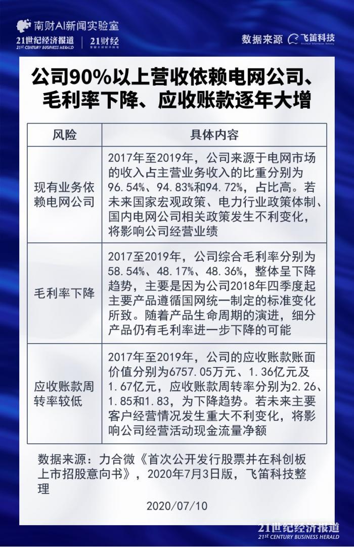 其次是毛利率下降风险。2017至2019年,公司综合毛利率分别为58.54%、48.17%、48.36%,整体呈下降趋势,主要是因为公司2018年四季度起主要产品由窄带电力线载波通信芯片及模块变为高速电力线载波通信芯片及模块,各厂商产品由遵循各自标准变为遵循国网统一制定的标准,市场竞争由不完全竞争变为完全竞争,从而导致全行业毛利率下降。公司提示,目前产品结构已基本变化完成,但随着产品生命周期的演进,细分产品仍有毛利率进一步下降的可能,进而导致综合毛利率的下降,对公司持续盈利能力造成不利影响。