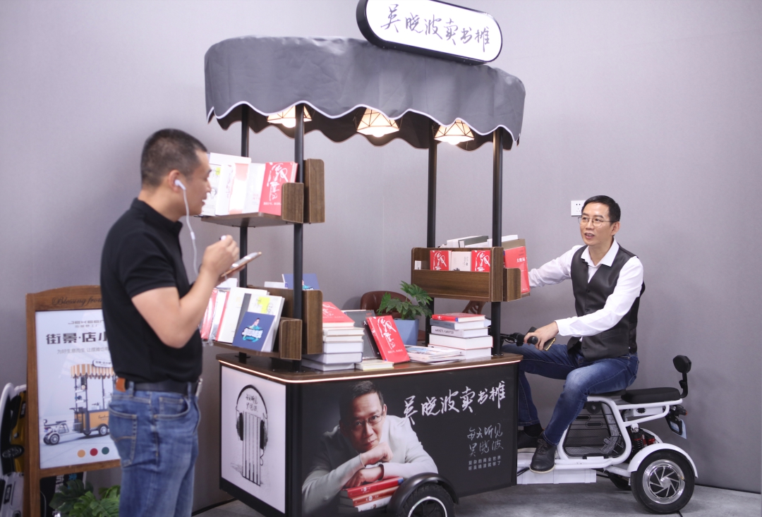 我给文君打电话,问他能不能为“新国货首发”定制一款电动地摊车,售价不得超过1万元,为现在的地摊创业者提供一个体面的售货工具。他在电话那头满口答应,仅用了半个月时间就研制出了“店小驴”。他还很有创意地为我定制了一个“吴晓波卖书摊”。