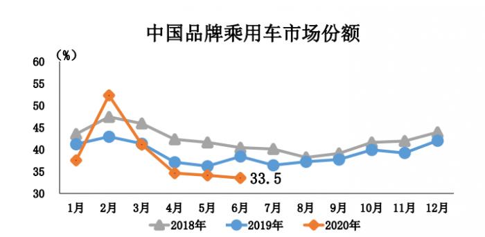 今年6月,中国品牌乘用车销量为59万辆,同比下降11.6%,市场份额仅为33.5%,创下2009年有记录以来的单月份额最低成绩。