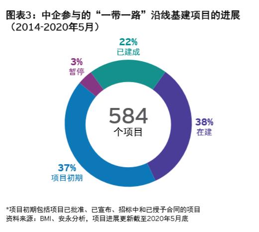 中企在南亚和东南亚地区活跃程度最高,有中企参与项目的国家分布也较集中,中企在前十大国家参与项目的金额占总参与金额的66%。随着“一带一路”倡议的深入推进,近年来基建项目加速落地,据统计,2014年以来宣布的项目中,一半以上已经处于已建成或在建阶段。