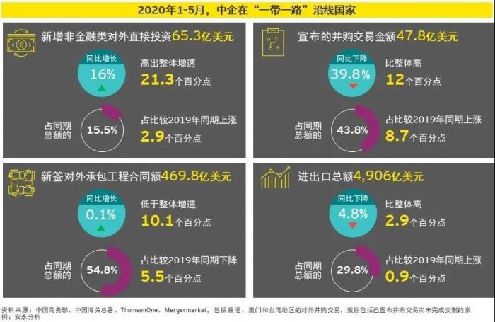 据安永7月9日发布的《海外产业园区如何开启“一带一路”合作新篇章?》,受疫情影响,2020年1-5月,中国进出口总额1.6万亿美元,同比下降7.7%,其中与“一带一路”沿线国家进出口总额达4906亿美元,同比下降4.8%,但仍高出整体增速2.9个百分点。2020年1-5月,与中国贸易额增长前五大的“一带一路”沿线国家为越南、泰国、伊拉克、以色列、土耳其。
