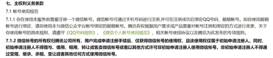 中新经纬记者注意到,《腾讯微信软件许可及服务协议》第七条明文规定,微信帐号的所有权归腾讯公司所有,初始申请注册人不得赠与、借用、租用、转让或售卖微信帐号或者以其他方式许可非初始申请注册人使用微信帐号。