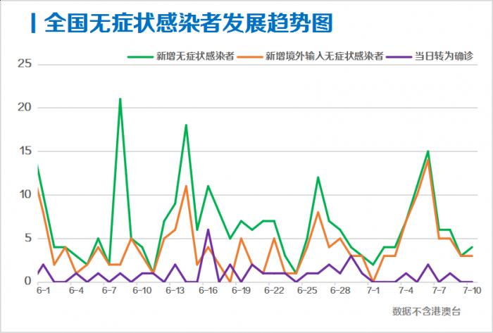 7月10日,全国新增无症状感染者4例,其中境外输入3例;当日无转为确诊病例;当日解除医学观察6例(境外输入3例);尚在医学观察无症状感染者111例(境外输入82例)。