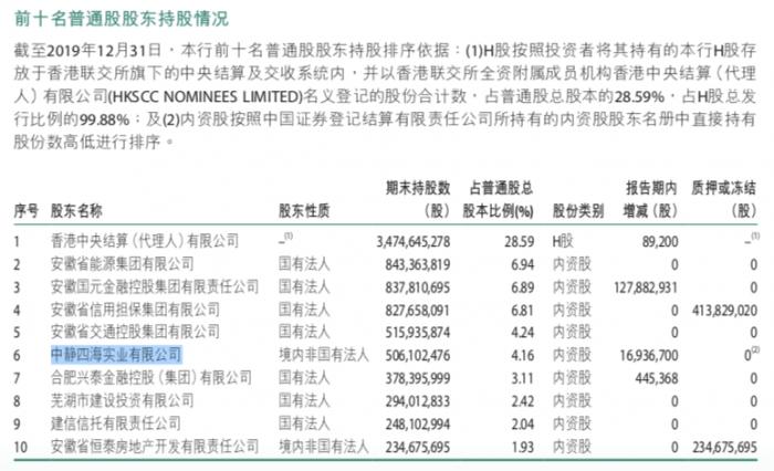 具体来说,徽商银行2019年年报显示,中静新华持有徽商银行内资股约2.25亿股,中静四海则持有徽商银行约5.06亿股。