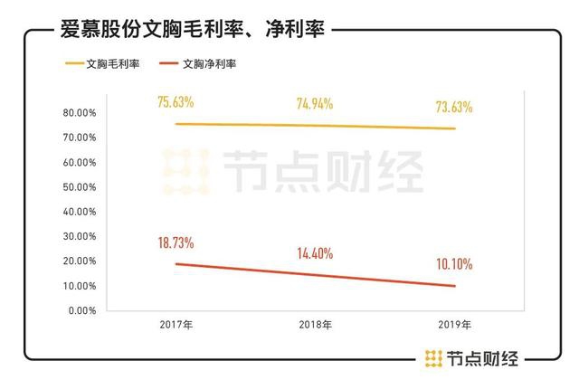 2017年至2019年,爱慕股份的综合毛利率分别为73.82%、72.26%和70.73%,期间各品类毛利率均有所下降。其中,文胸的毛利率为75.63%、74.94%和73.63%;净利率分别为18.73%、14.40%、10.10%。