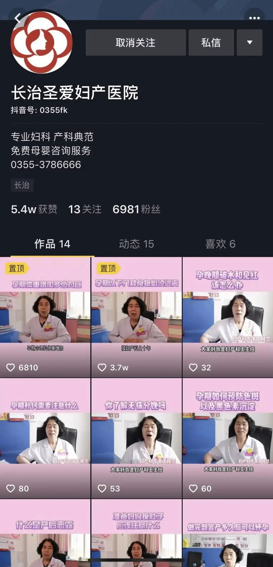 另一家长治圣爱妇产医院,其抖音号上的作品以医生讲解孕期注意事项为主。主页上至今14个作品,最早的发布日期在4月25日,其一的置顶视频有近4万点赞,也就是说,两个多月的运营收获了近六千粉丝数。