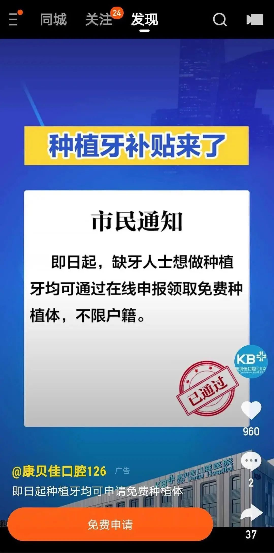 广告分别来自北京中诺口腔医院和北京康贝佳口腔,视频内容均是推荐用户矫正牙齿、种植牙齿,用户可直接进入报名界面填写个人联系方式。
