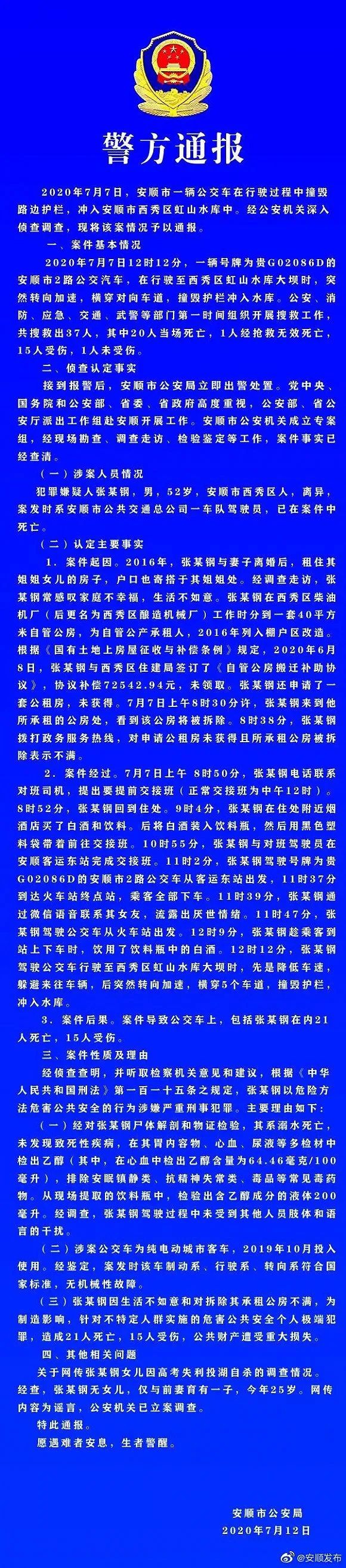 2020年7月7日中午12时许,安顺市一辆公交车在行驶过程中撞坏湖边护栏,坠入安顺市西秀区虹山水库中。事件发生后,公安部、应急管理部等国家有关部门及省、市迅速组成调查组开展缜密调查,现将有关情况通报如下: