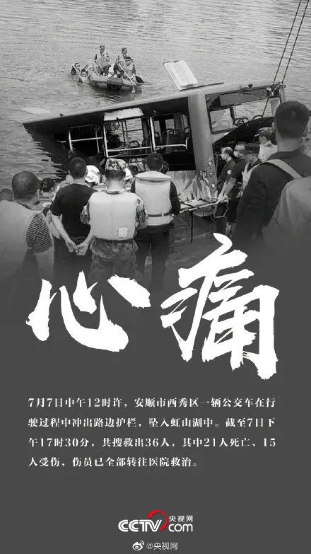 据人民日报,7月7日中午12时许,安顺市西秀区一辆公交车在行驶过程中冲出路边护栏,坠入虹山湖中。截至7日下午17时30分,共搜救出36人,其中21人死亡、15人受伤,伤员已全部转往医院救治。